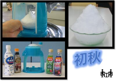 かき氷機(電動・手動)で、お皿を回すのを手伝ってもらいながら、削っていきました。みんなで協力して行いました。