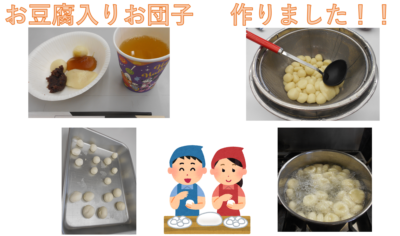10月3日(金)に豆腐入りのヘルシーな団子を作りました。白玉粉と豆腐を混ぜ、捏ねます。耳たぶくらいの柔らかさになったら、丸めます。中には、ハートの形やスライムの形をしたお団子も!!茹でて水で冷まして完成です🍡